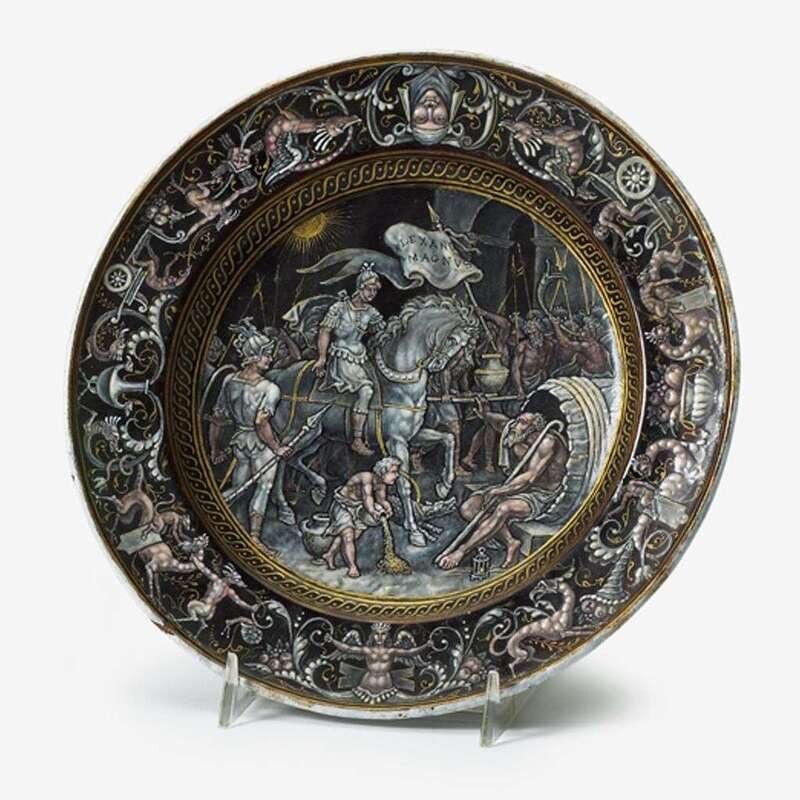 Circular form, the center painted to depict the meeting of Alexander the Great and Diogenes before various soldiers and attendants, all within a grotesque painted to the rim, the obverse centrally painted with a pair of putti flanking a winged angel with trumpets, unsigned.