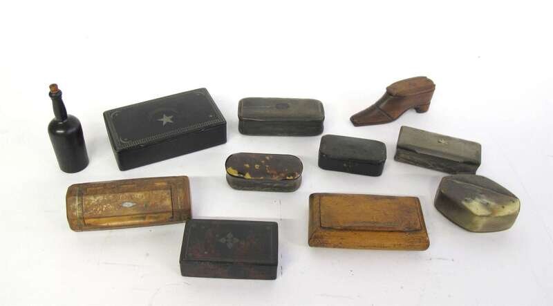 Mostly continental, comprising three treen, one in the form of a shoe, and eight horn, tortoiseshell, specimen wood, and lacquer boxes of various shapes and sizes. (11).