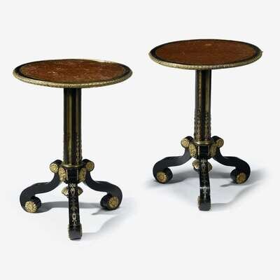 Pair of Regency steel inlaid and gilt metal mounted ebonized side tables first quarter 19th century