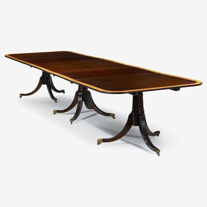 Regency style mahogany and satinwood cross banded triple pedestal dining table