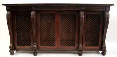 The long rectangular top over rosette mounted frieze over four cupboard doors and four acanthus and scroll carved s-shaped supports, raised on ball feet.