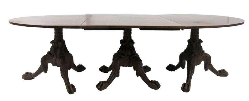 The wide crossbanded pine top in three sections, each raised on elaborately carved leaf and eagle's leg pedestals.