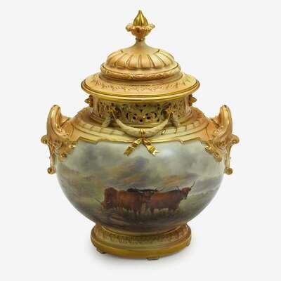 Surmounted by a blush ivory cover with gilt finial, the pierced neck suspending festoons and mounted with handles to each side, the body finely painted with a group of highland cattle opposite a rocky shoreline, the base with puce printed mark and model number 1428.