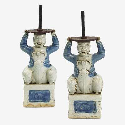 Modeled in the form of a squatting European man with finely carved beard, atop a shaped plinth and holding a quatrefoil form tray issuing a central candlestick. (2).