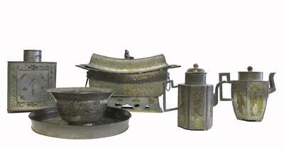 Comprising two teapots of differing forms, a bowl, tea caddy, circular tray and elongated covered box, each with incised bronze decoration of various forms. (6).