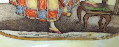 Finely painted with vignettes showing a lady tying her garter above the motto "honi soit qui mal y pense".