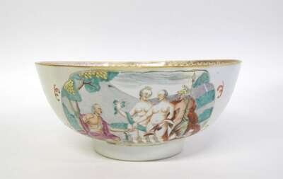 The largest painted with peacocks amidst prunus flowers below a gilt and iron red border; the other with panels depicting the Judgment of Paris. (2).