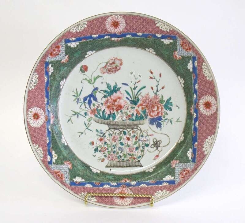 Enameled to the center with a basket of peonies and prunus flowers against a white reserve, all held within a square panel enameled with prunus flowers against a green ground, the panel with folded corners extending over the cavetto onto a pink diaper ground rim.