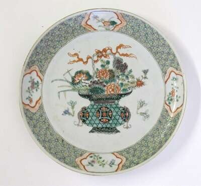Centrally enameled with a basket issuing prunus flowers against a white reserve, with four shaped panels depicting prunus flowers on the diaper ground rim.
