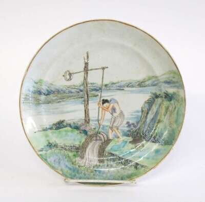 Centrally enameled to show a man irrigating a paddy field.