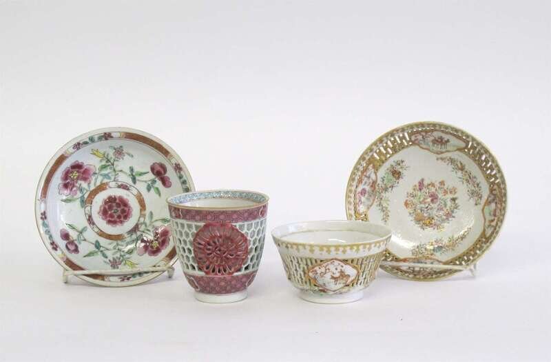 Two Chinese export porcelain double-walled teabowls and saucers 19th century