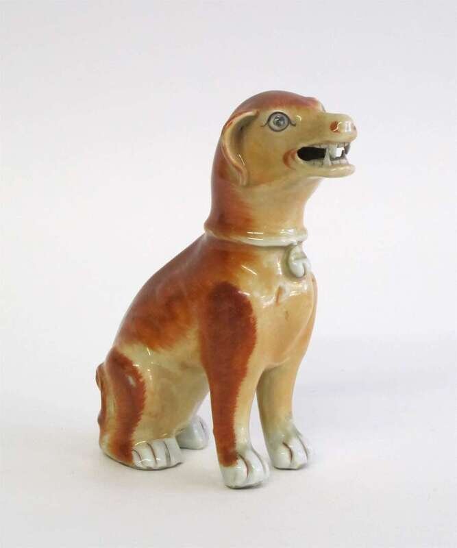 Depicted bearing its teeth, glazed with a red coat and modeled in a seated position.