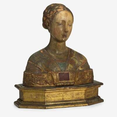 The Renaissance style female figure with plaited hair and in typical attire, raised on integral faux bronze base relief carved with putti around a scroll plaque to the center, impressed '29' four times to the interior, raised on parcel gilt polychrome wood lozenge shaped plinth.