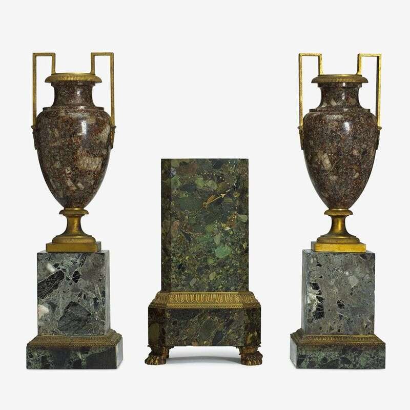 The clock case in the form of breccia marble tablet with canted corners mounted with gilt bronze Arabic hours and star form minutes to form the dial above gilt foliate border, raised on lion's paw feet, the twin handled red breccia di aleppo garniture urns raised on separate verde antico pedestals mounted with gilt foliate border above stepped base.