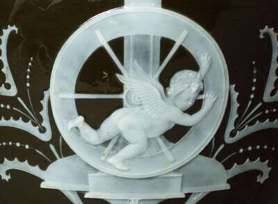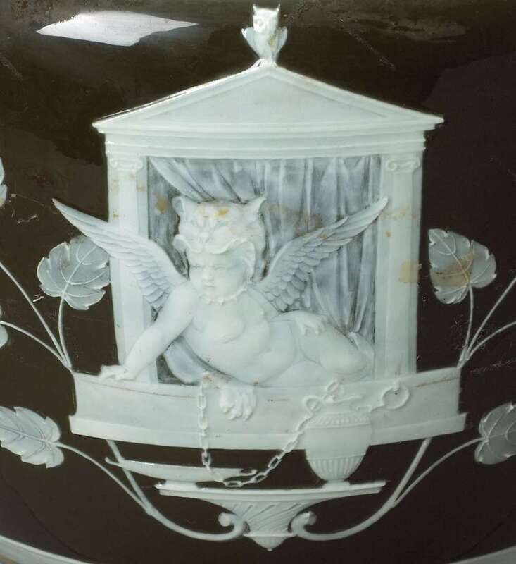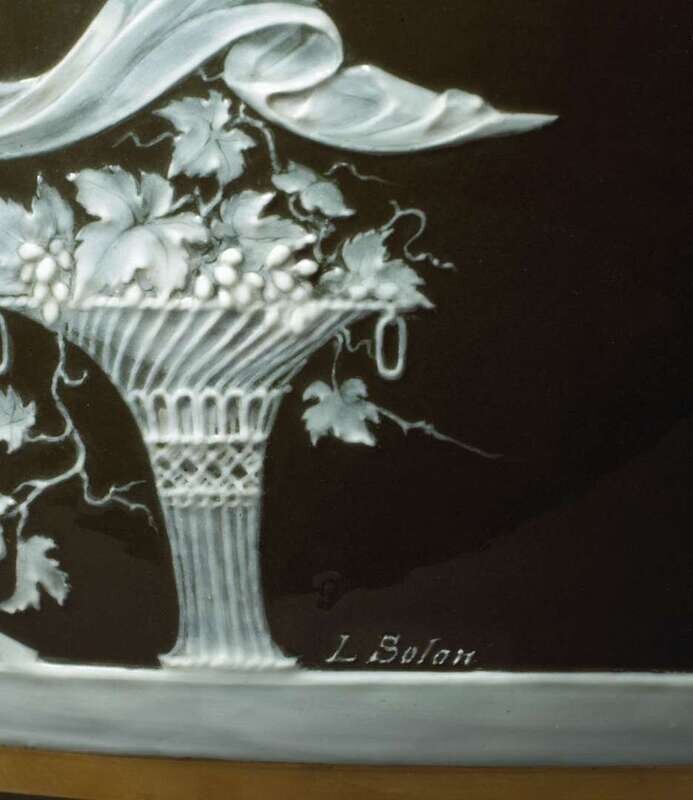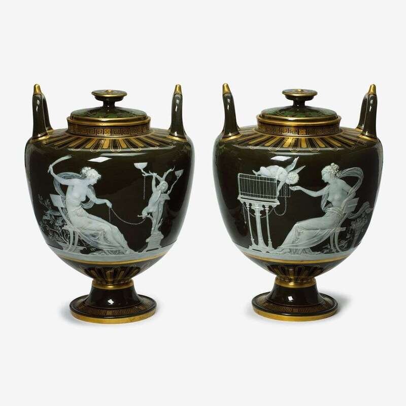 The classical form urn decorated to the shoulder with brown and gilt radials and mounted to each side with upraised handles, above a tapering ovoid body finely decorated in cream slip to show a seated classical maiden offering fruit to a chained putti resting atop his cage, the obverse depicting a putti in lion skin resting in window frame; the other urn depicting a maiden raising a switch to a chained putti, the obverse with putti resting on a captain's wheel, the vignettes alternating with gilt and green stylized tendrils below each handle, raised on socle and wide foot encircled by a Greek key border, signed L. Solon, the underside with retailer's mark for A.B. Daniell & Sons, London. (2).