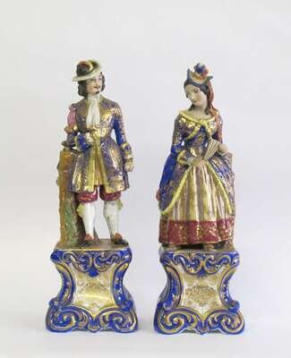 Including a cavalier and lady, each vibrantly dressed in gilt cobalt and pink garments and wearing a hat, standing atop a shaped pedestal terminating in scroll feet. (2).