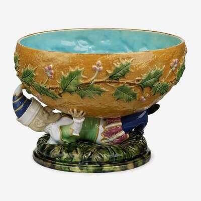 Large George Jones majolica yellow ground "Punch" punch bowl second half 19th century