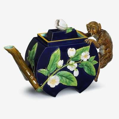 The cover surmounted by flower bud finial, the cobalt body molded with floral and foliate sprays issuing from the branch form spout, the handle in the form of a monkey, the u-form underside impressed with registration lozenge.