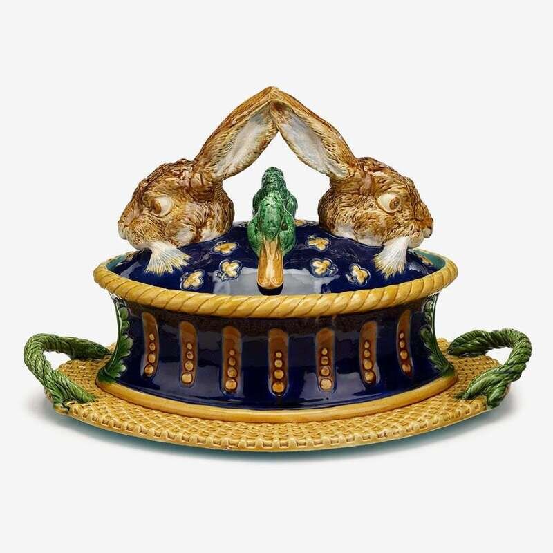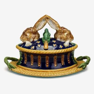 The cover humorously surmounted by a pair of mallards and a pair of hares, their ears joined to form a handle, each anxiously peeking its head out from 'within' a pâte mold form dish below, the dish supported by an integral basketweave tray mounted with rope handles to each end, impressed Mintons, shape number 1990, date cypher for 1876 to base.