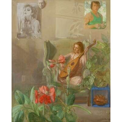 BEN KAMIHIRA (AMERICAN, B. 1925) "SEATED WOMAN WITH POSTERS"