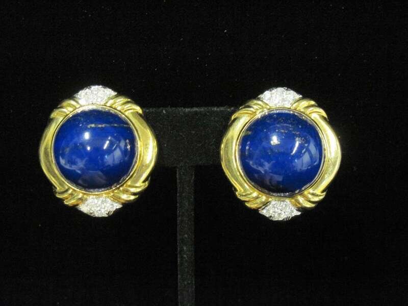 centering round cabochon lapis lazuli accented by pavé-set diamonds; total diamond weight approximately: 0.75 carat.