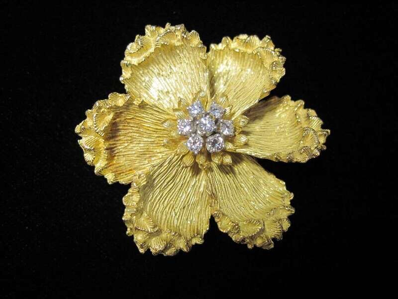designed as a textured gold flower centering seven round brilliant-cut diamonds; total diamond weight approximately: 0.40 carat.