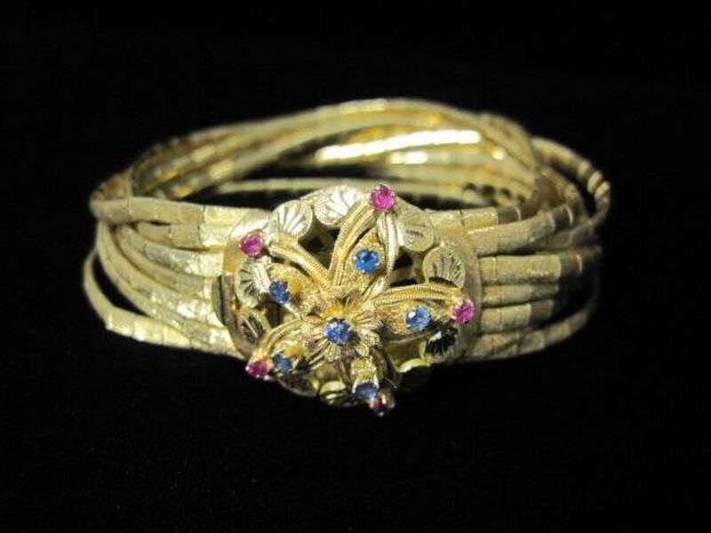 eleven strands with textured gold links; round-cut ruby and sapphire clasp; Italian assay marks.