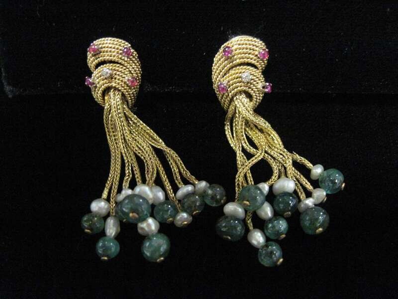 crescent shape surmounts set with cabochon rubies and single-cut diamonds suspending seed pearls and emerald beads.