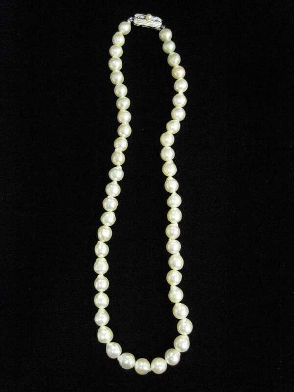 off-round pearls completed by silver clasp; maker's mark for Mikimoto.