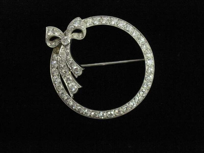 circle and bow accent set with round brilliant and single-diamonds; total diamond weight approximately: 2.50 carats.