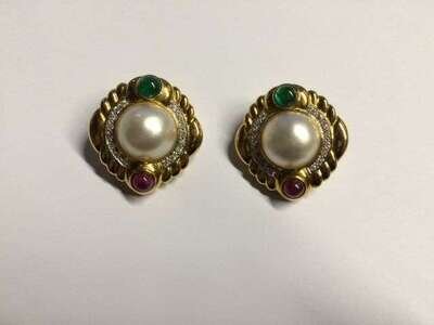 *A pair of cultured mabé pearl, emerald, ruby, diamond and eighteen karat gold earrings
