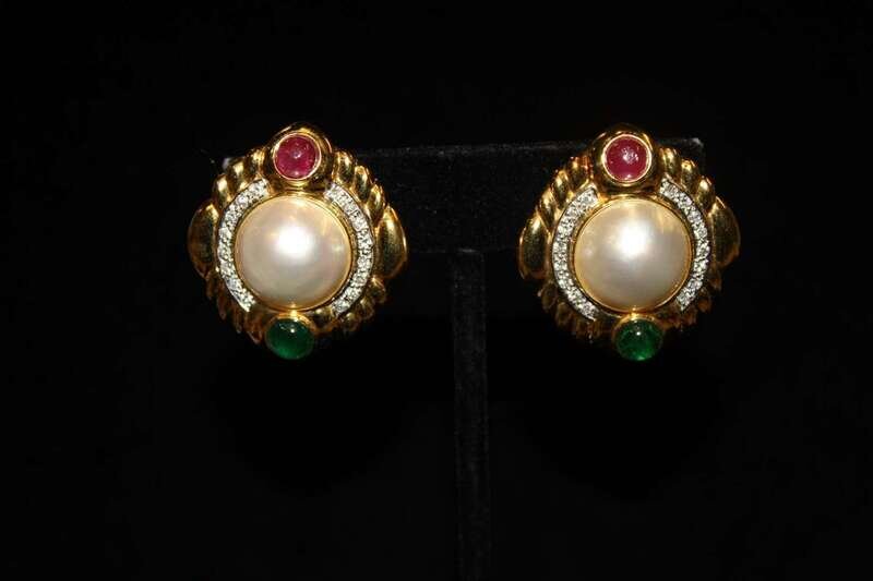 each centering a mabé pearl, flanked by cabochon emeralds and rubies, in a polished fluted gold and full-cut diamond partial surround; total diamond weight approximately: 0.60 carat.