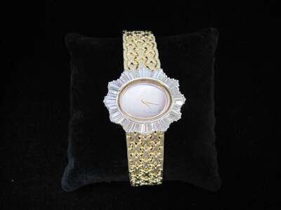 quartz movement; ballerina style bezel set with baguette-cut diamonds; total diamond weight approximately 5.00 carats.