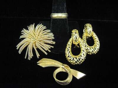 including ten and fourteen karat gold; consisting of two brooches, one ring and one pair of earrings.