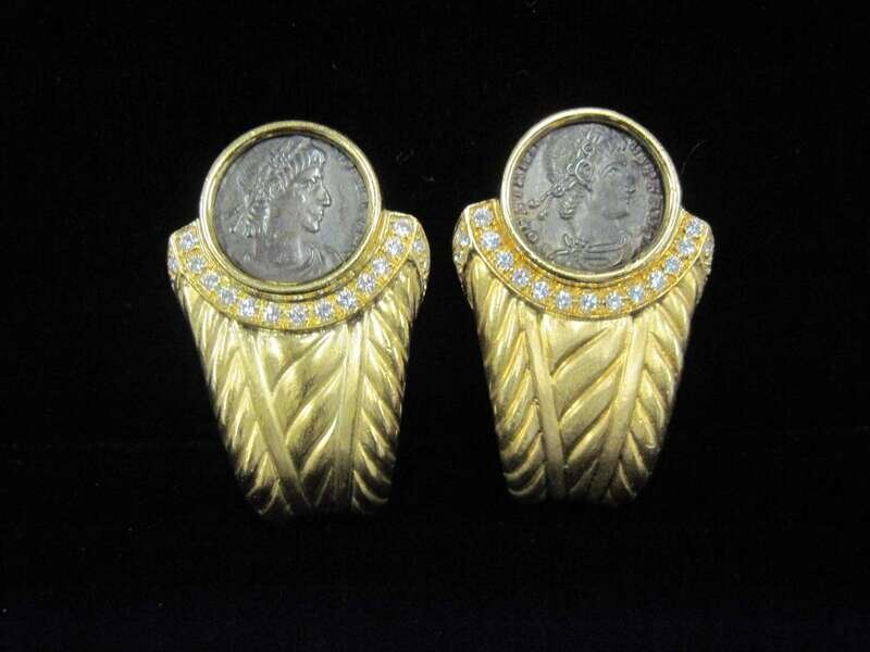 bezel-set ancient Constantine coins; accented by full-cut diamonds and matte gold; total diamond weight approximately: 0.80 carat; signed Tinelli wirh maker's mark and serial no. 307-337.