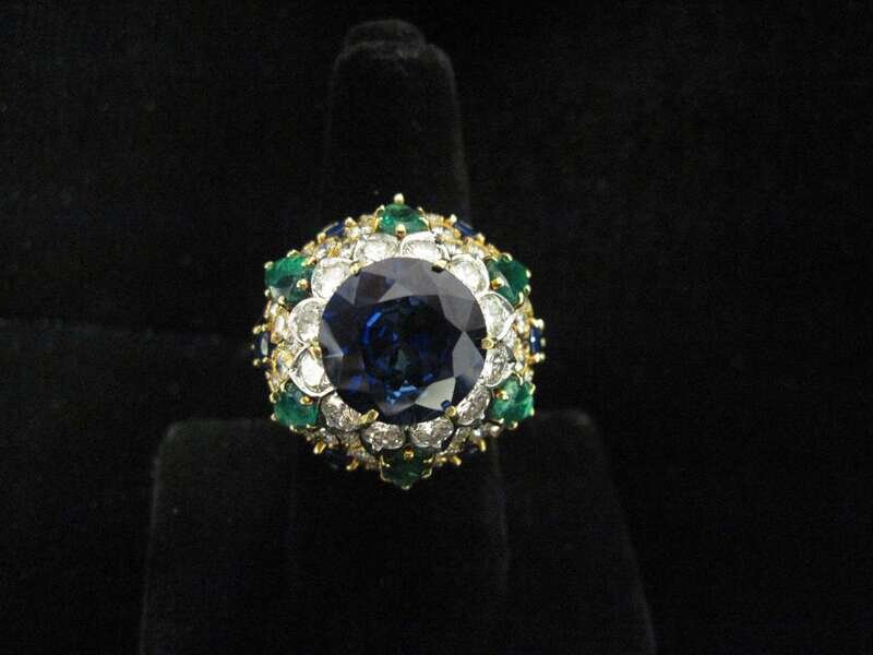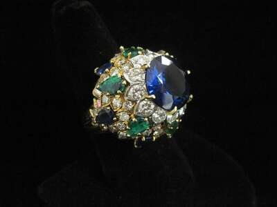bombé foliate motif featuring round brilliant-cut synthetic sapphire in a round brilliant-cut diamond surround and accented by pear-cut sapphires, emeralds and round brilliant-cut diamonds; total diamond weight approximately: 4.45 carats.