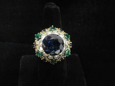 A synthetic sapphire, sapphire, emerald, diamond and eighteen karat gold ring