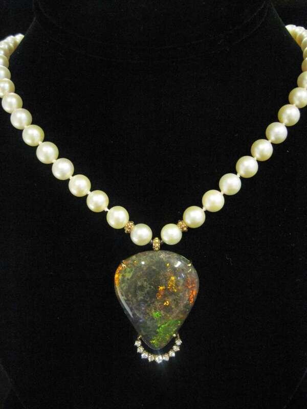 pearl necklace with drop-shaped cabochon black opal; accented with round brilliant-cut diamonds; French assay marks.