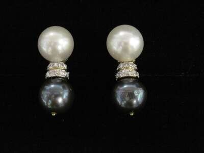 one pair with pearl and black pearl accented by full-cut diamonds; other pair with onyx and mabé pearl with pavé-set diamonds; total diamond weight approximately: 3.25 carats. *Please note: only select items shown in image.