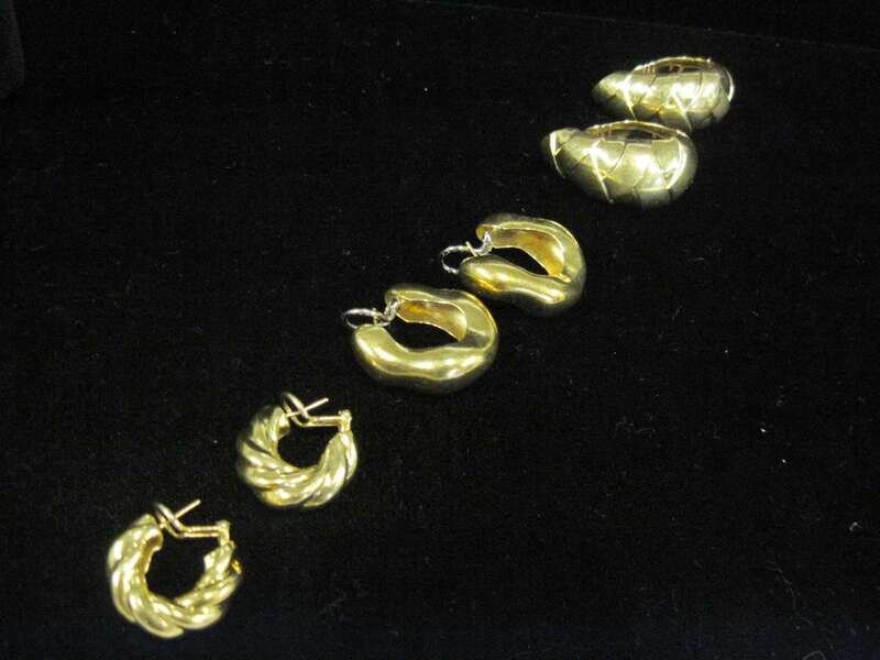 A collection of three pairs of eighteen karat gold earrings