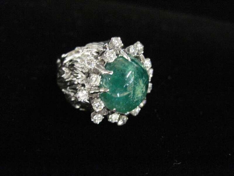 centering one round cabochon emerald in a white gold and round brilliant-cut diamond surround; total diamond weight approximately: 1.25 carats.