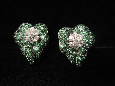 designed as a leaf set with round-cut green stones and centering full-cut diamonds; total diamond weight approximately: 0.75 carat.