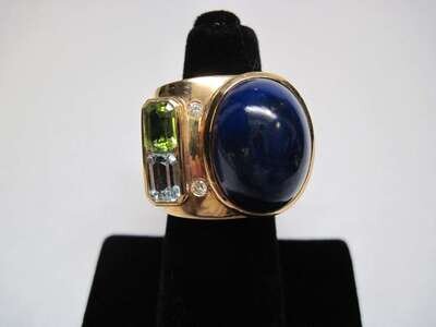 A lapis lazuli, peridot, aquamarine, diamond and eighteen karat gold ring