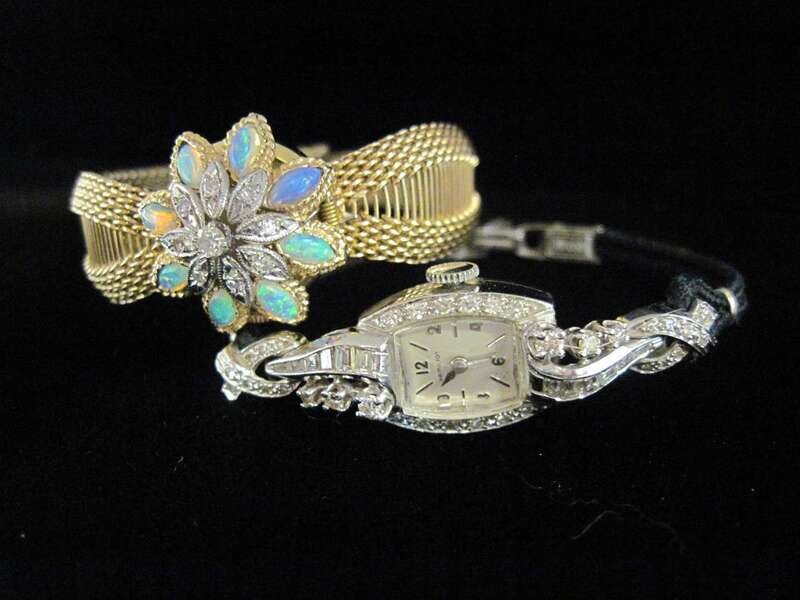 A collection of two diamond, opal, gold and platinum bracelet watches