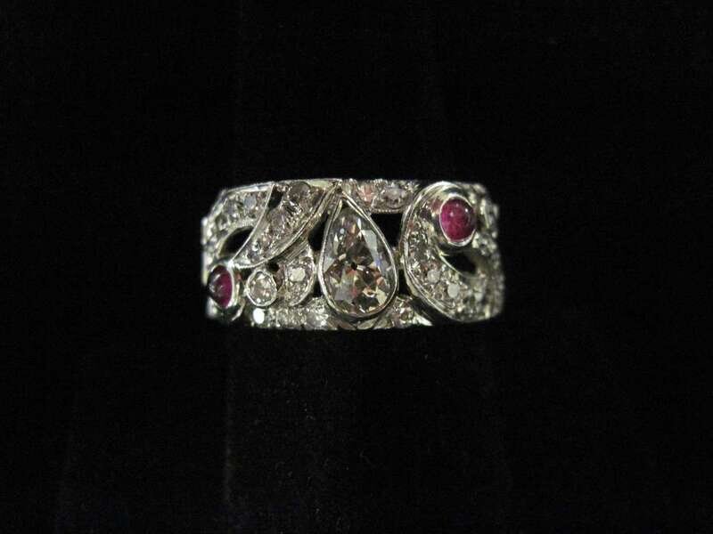 highlighting one pear shape diamond weighing approximately 0.50 carat and accented by round brilliant and single-cut diamonds and cabochon rubies.
