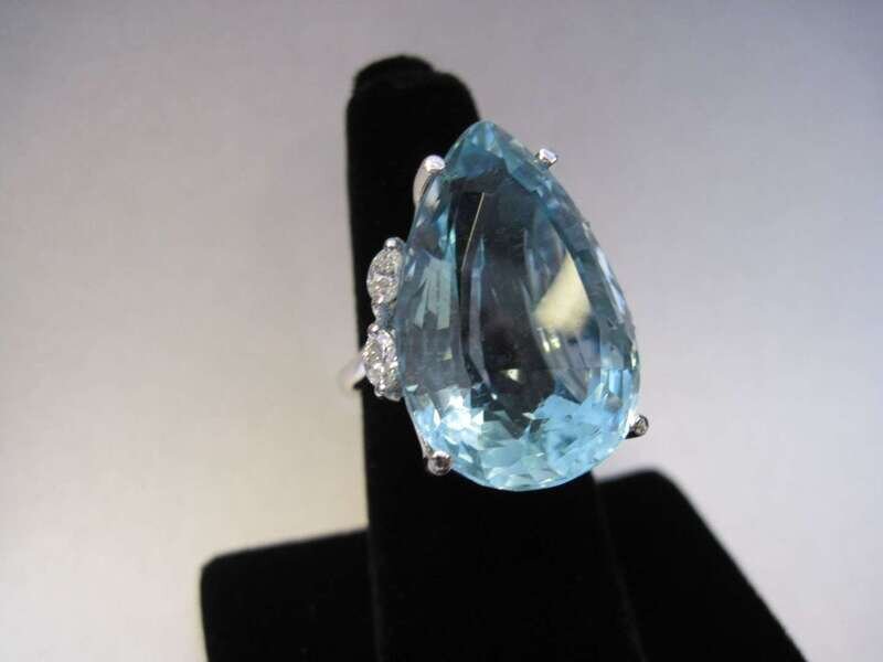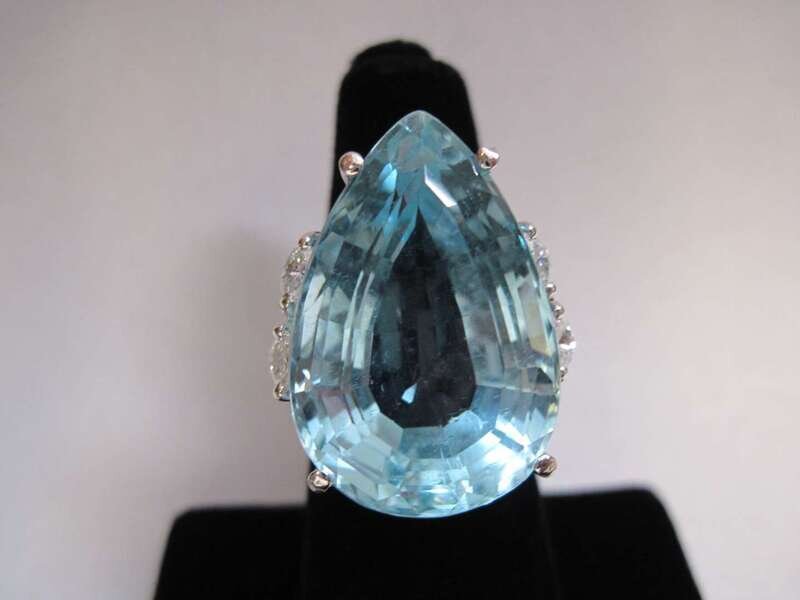 centering a modified pear-shaped aquamarine weighing approximately: 31.00 carats; accented by marquise-cut diamonds.