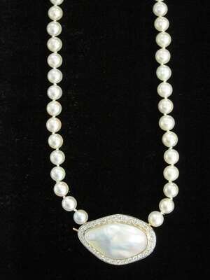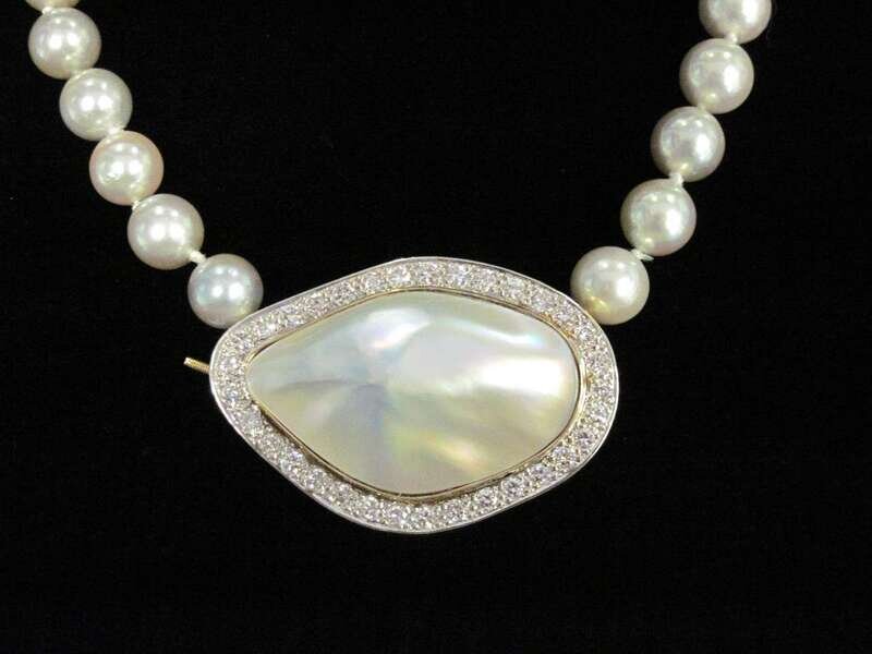 single strand of silver pearls (pearls not tested for origin of color) measuring approximately: 9mm; with removable mabé pearl and diamond pendant; with matching mabé pearl ear-clips; total diamond weight approximately: 5.00 carats.