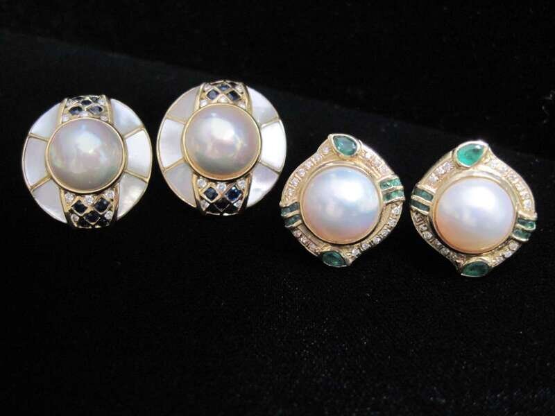 *A collection of two pairs of mabé pearl, Mother-of-pearl, gem-set, diamond and gold earrings