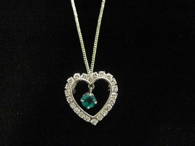 set with round brilliant-cut diamonds; total diamond weight approximately 0.90 carats and suspending one round emerald.
