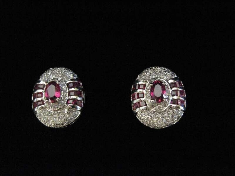 *A pair of ruby, diamond and eighteen karat white gold earrings and ring